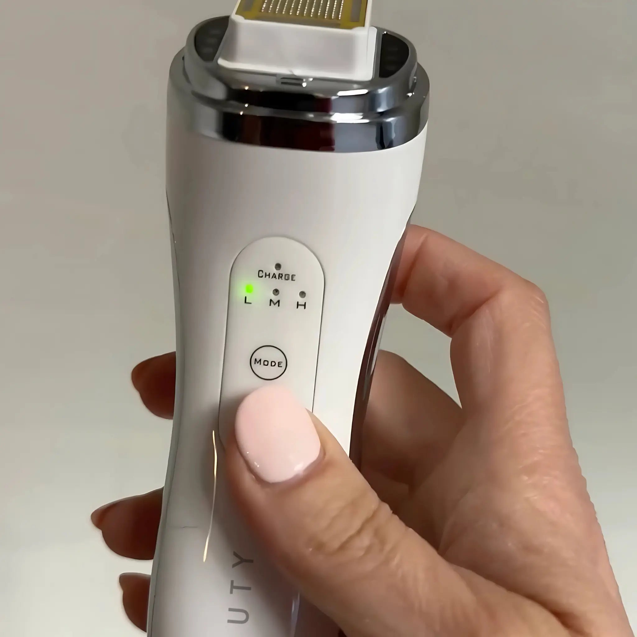 Turn on your VEAUTY Dot and wait for the green light. Choose Low, Medium, or High - start on Low to let your skin adjust.