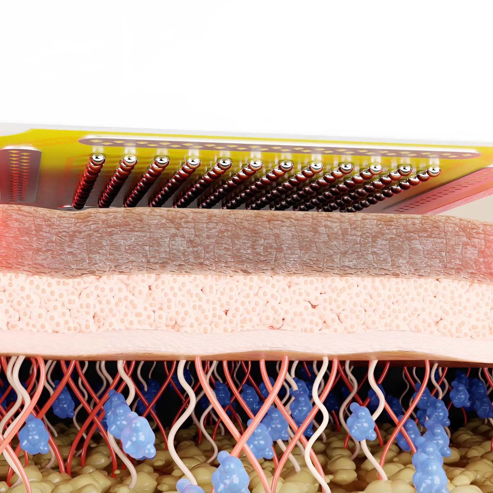 When the VEAUTY Dot touches the skin, its fractional radio-frequency energy penetrates through the epidermis (outer layer) and into the dermis (the deeper, structural layer of the skin). The dermis is where collagen, elastin, and hyaluronic acid are found - the key proteins responsible for firmness, elasticity, and hydration.