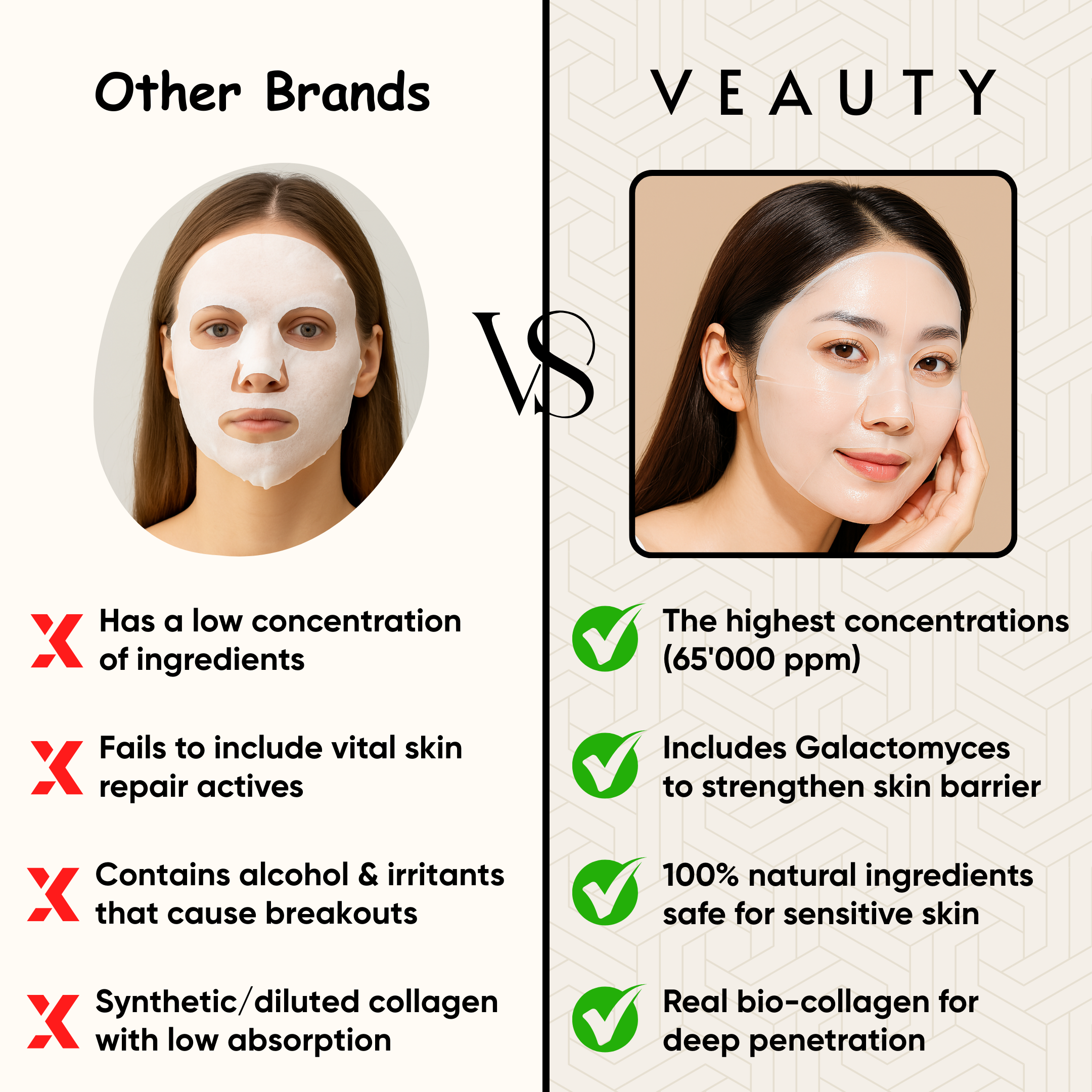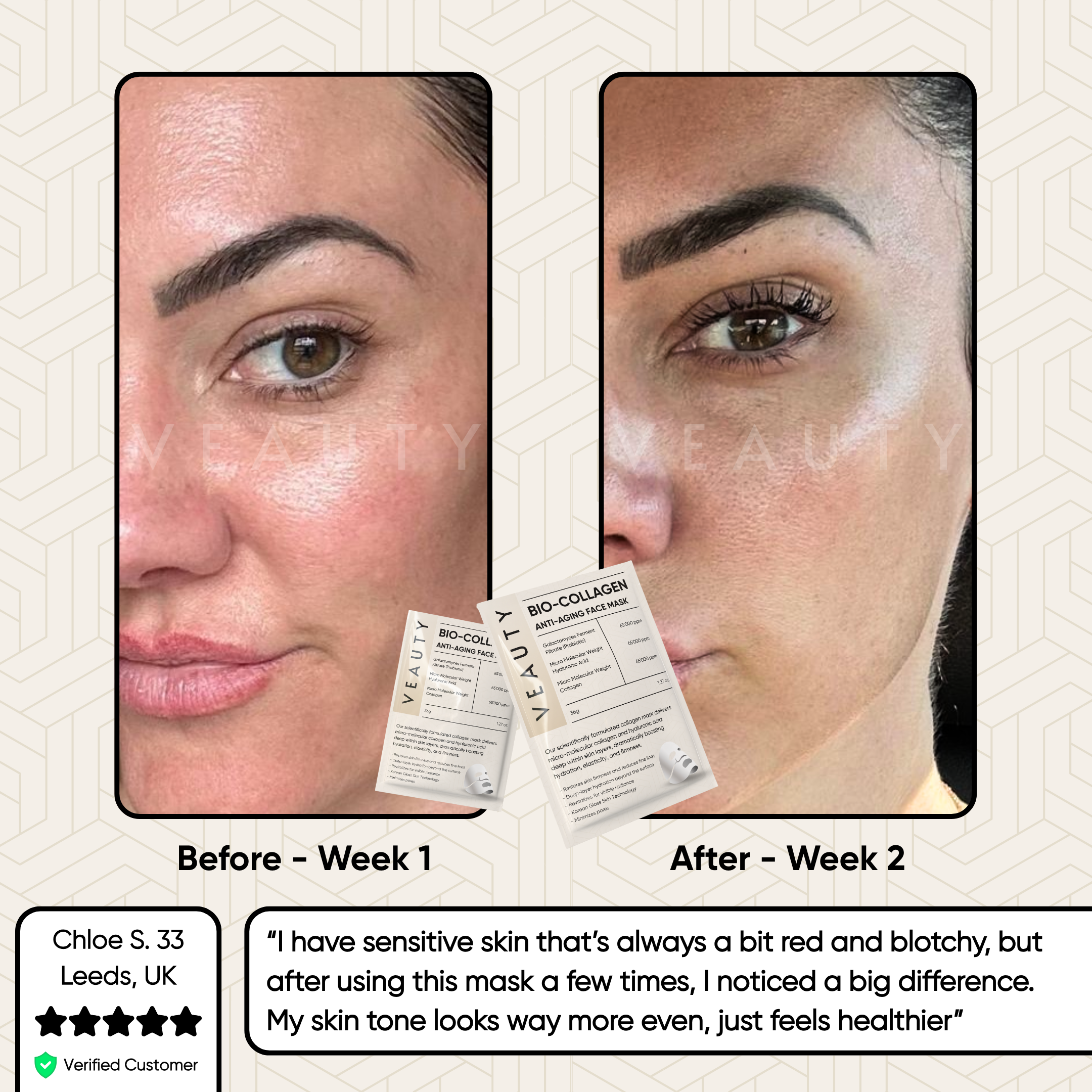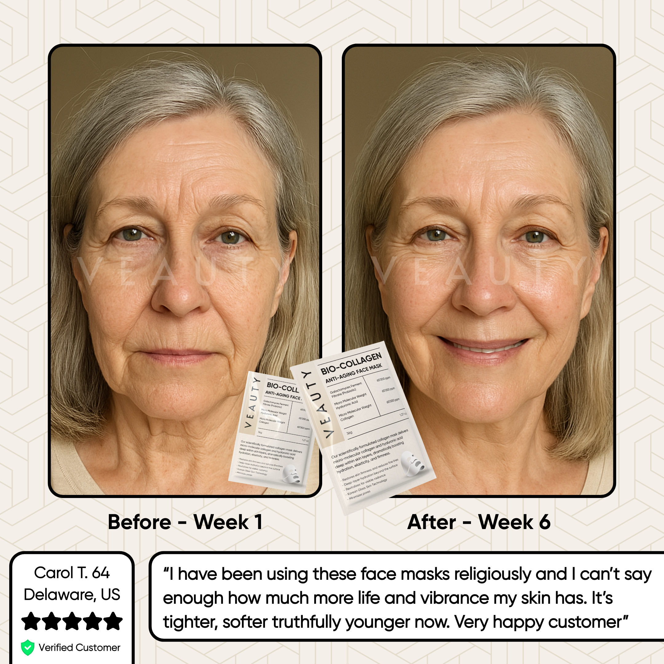 Based on an independent study conducted in 2025 by VEAUTY COSMETICS on 120 people 14 days after using the Veauty Bio-Collagen Face Mask. Results may vary.